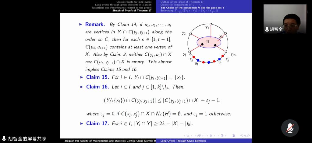 邀请,8月3日上午,华中师范大学胡智全教授在腾讯会议作了题为《Long cycles in graphs passing through given elements》的报告。相关师生聆听了此次报告,报告由卢福良教授主持。