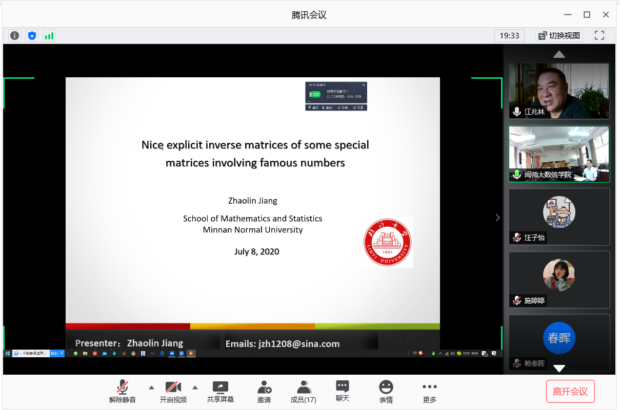 邀请,7月10日上午,临沂大学江兆林教授在腾讯会议作了《Nice explicit inverse matrices of some special matrices involving famous numbers》的报告。相关师生聆听了此次报告,报告由林梦雷院长主持。