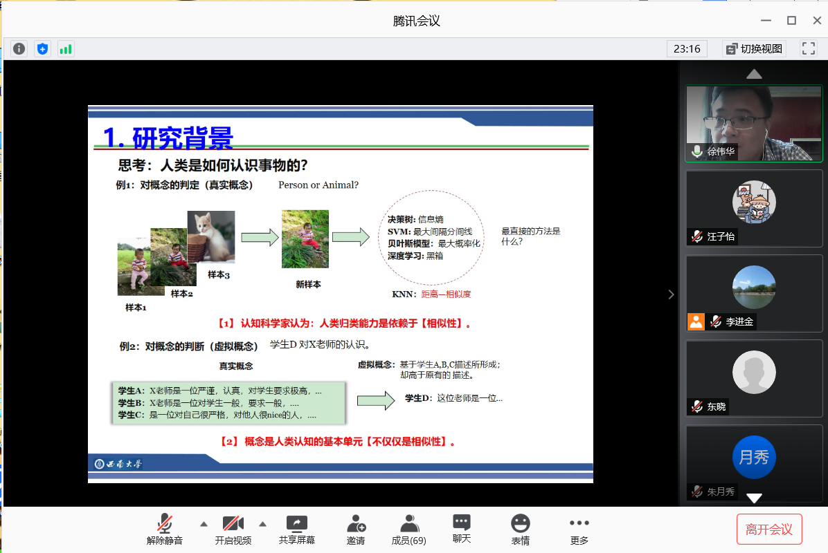 邀请,6月27日上午,西南大学徐伟华教授在腾讯会议作了《概念认知学习的粒计算机理及其最新研究进展》的报告。相关师生聆听了此次报告,报告由李进金教授主持。