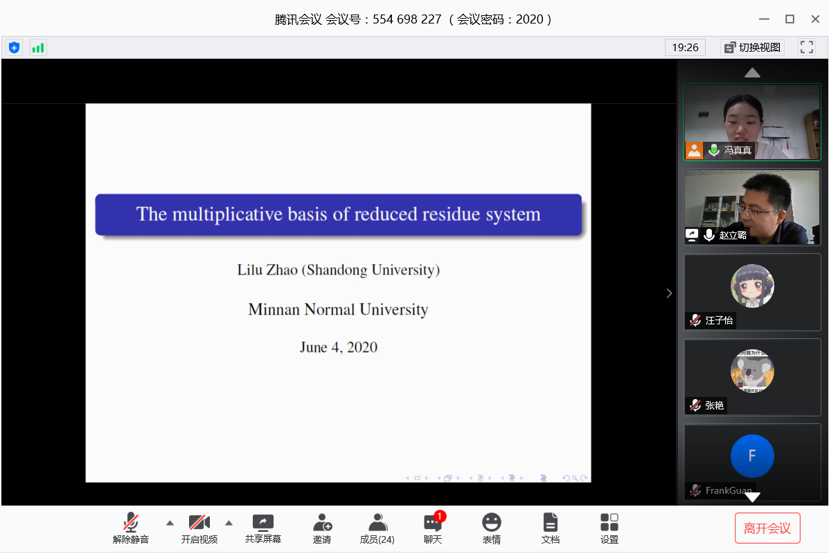 邀请,6月4日上午,山东大学的赵立璐教授在腾讯会议作了《The multiplicative basis of reduced residue system》的报告。相关师生聆听了此次报告,报告由冯真真老师主持。