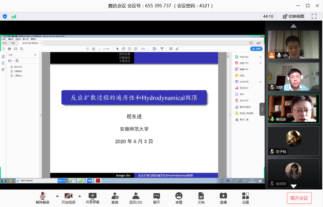 邀请,6月3日上午,安徽师范大学祝东进教授在腾讯会议作了《一类反应扩散过程的遍历性和Hydrodynamical limit》的报告。相关师生聆听了此次报告,报告由施建华副教授主持。