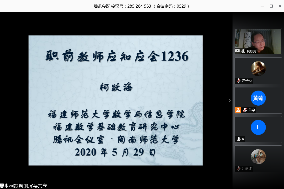 邀请,5月29日上午,福建师范大学柯跃海副教授在腾讯会议作了《职前教师应知应会1236》的报告。相关师生聆听了此次报告,报告由林伟华副教授主持。