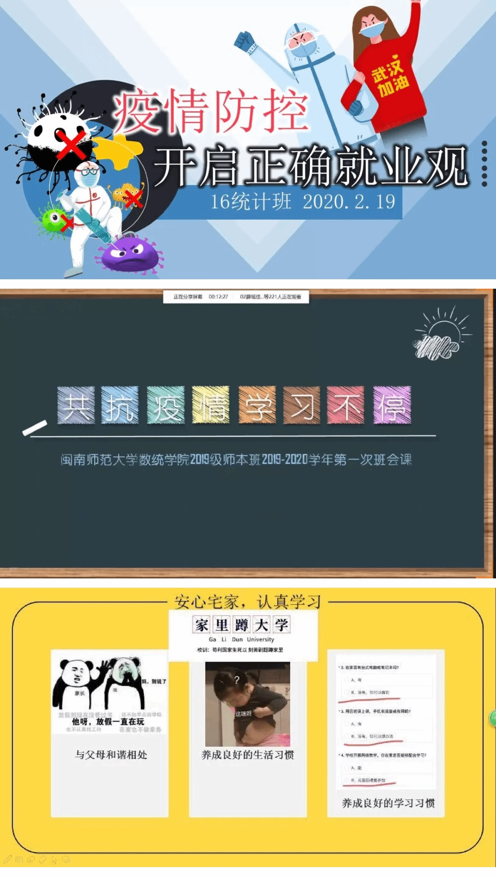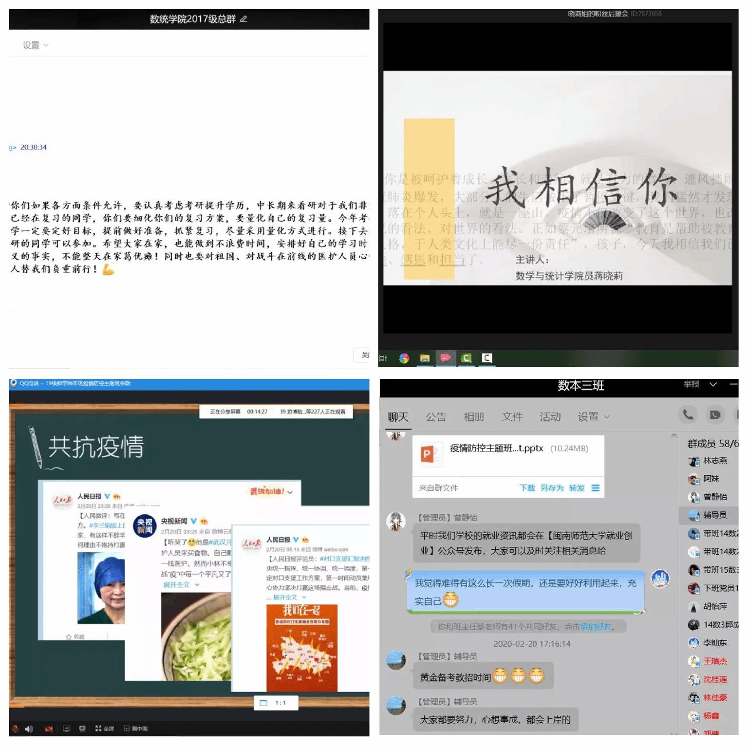 各级辅导员心系学生安危,积极以“战‘疫’思考”主题班会,围绕爱国情怀教育、理想信念教育、自律教育、社会责任感教育等内容,利用微信、QQ、腾讯直播等网络平台,以线上班会形式进行。