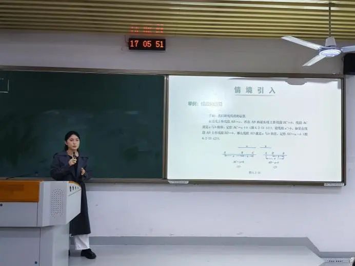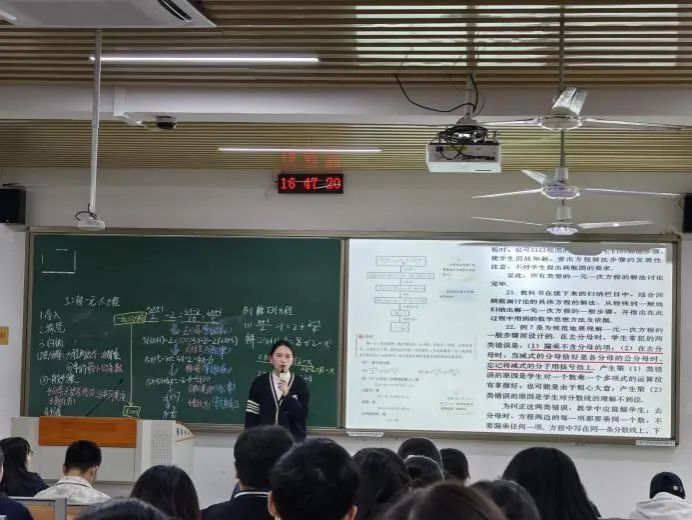 首先陈雅妮同学为大家带来了一场生动的片段教学试讲,她围绕情境导入、教材探究、教材归纳三个环节展开。从一个贴近生活的情境引入课程内容,巧妙地探讨教材与现实生活的联系,设计课堂练习,进行内容总结,有效帮助学生加深对教材的理解。她还特别强调了本节课的易错点,并对教材内容进行拓展和总结。这场教学示范兼具深度与广度,在座的同学对教学试讲有了更直观的认识和了解。