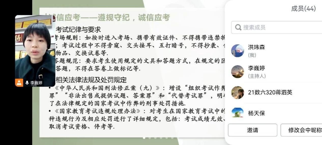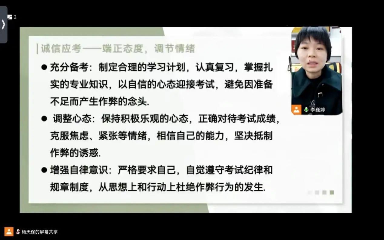 李巍婷老师从诚信应考出发,希望同学们能够遵纪守法、做到诚信应考,为同学们强调了考试过程中的纪律和要求,以及相关答题规范,也希望大家做到认真复习、端正态度,及时调整好考试情绪,保持一颗平常心,以积极、乐观的心态面对即将到来的挑战,坚决抵制作弊诱惑。