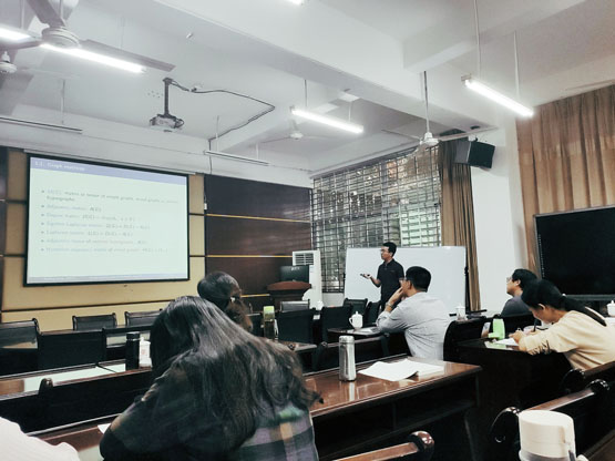 邀请,10月21日的下午,山东理工大学王建锋教授在砺志楼114作了题为《On the spectral radius of Aa-matrix of graphs》的报告。相关师生聆听了此次报告,报告由李建喜副院长主持。