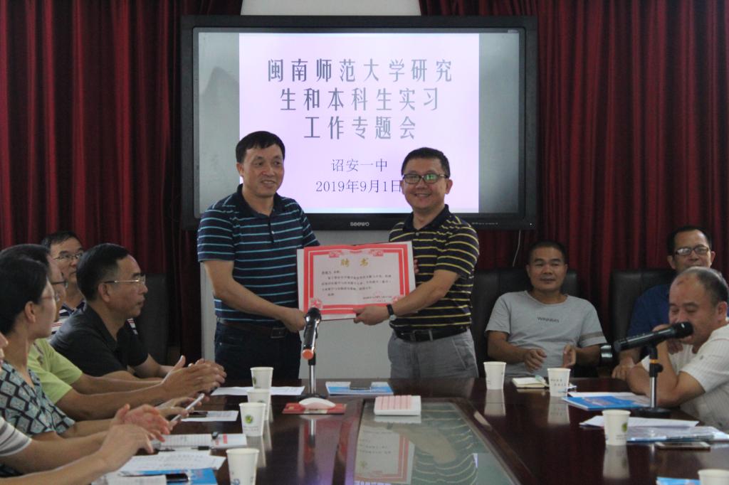 提供的机会和平台表示感谢,对实习生也提出了要求。他希望实习生主动与指导老师交流,并期待在教学成果上可以碰撞出新的火花。实习是实习生破茧成蝶的机会,胡海智强调,实习生应该抓住这次机会,不仅在教学手段、经验上得到增强,同时要学会完善自我,提升自己的综合素质。会后,胡海智为各中学指导老师代表颁发聘书。