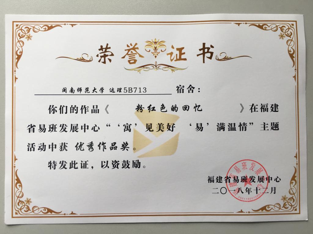 近日,福建省易班发展中心公布“‘寓’见美好,‘易’满温情”主题活动的结果,ace动漫 2017级学生(达理5B713宿舍)的作品《粉红色的回忆》在该活动中荣获优秀作品奖。