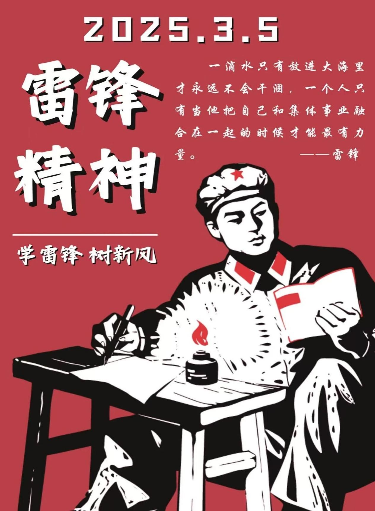 本海报以鲜明的红色为底色,寓意着雷锋精神的炽热与传承不息。日期“2025.3.5”明确点明雷锋纪念日,唤起人们对这一特殊日子的关注。画面主体中雷锋伏案书写的形象,展现出他专注坚毅的神情,以及热爱学习、积极向上的品质。桌上燃烧的火焰,不仅是照亮书写的光源,更象征着雷锋精神如火焰般炽热且具有强大的感染力,能驱散黑暗,照亮人们的心灵。