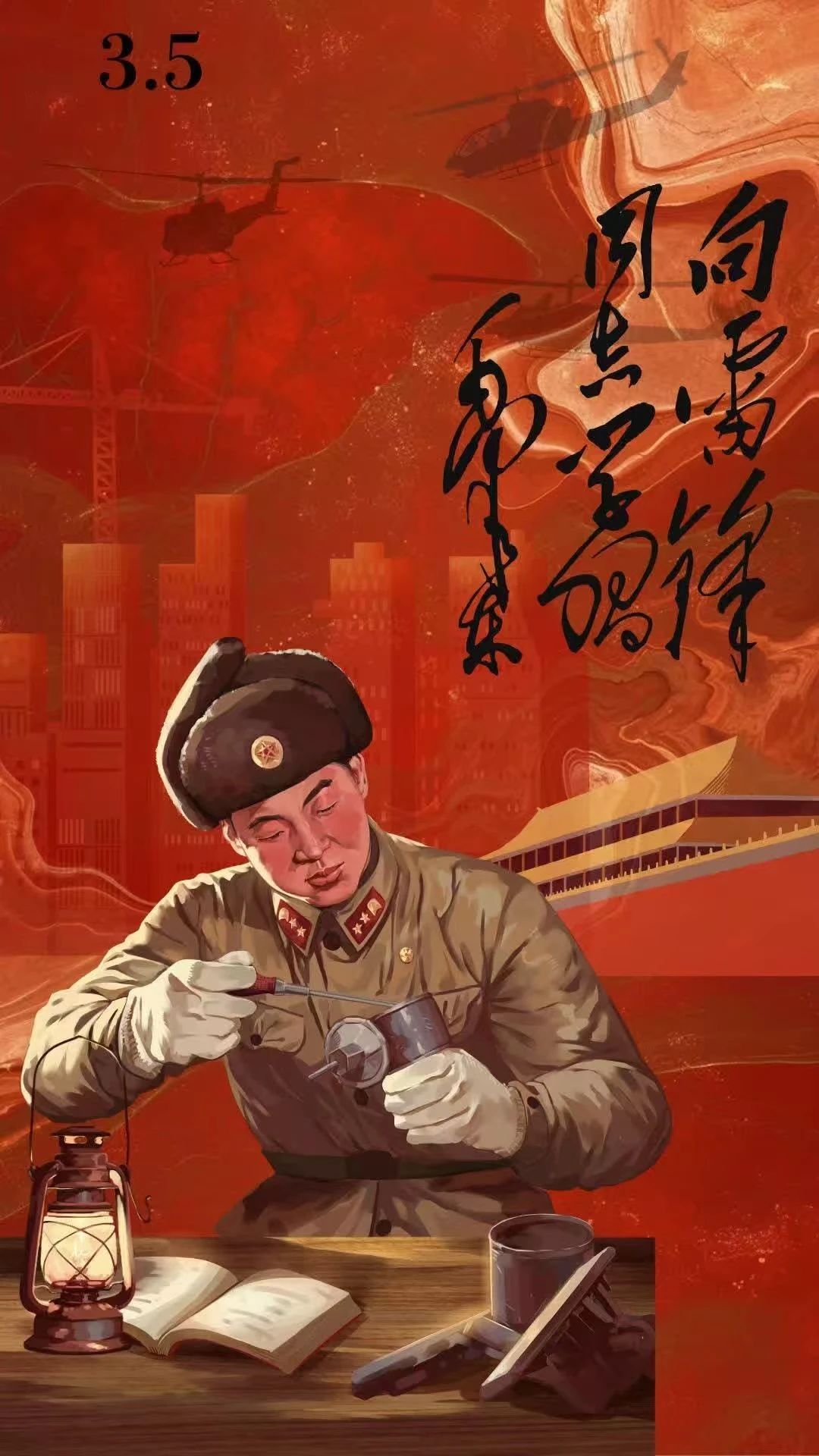 作品左上角出现的3.5是学雷锋纪念日,画面中雷锋身着军装专注修理物件,桌上的书籍、马灯等细节,展现其钻研与奉献精神。背景的城市建筑、直升机与天安门,寓意雷锋精神在时代发展中传承,“向雷锋同志学习”字样醒目,传递纪念与号召之意。