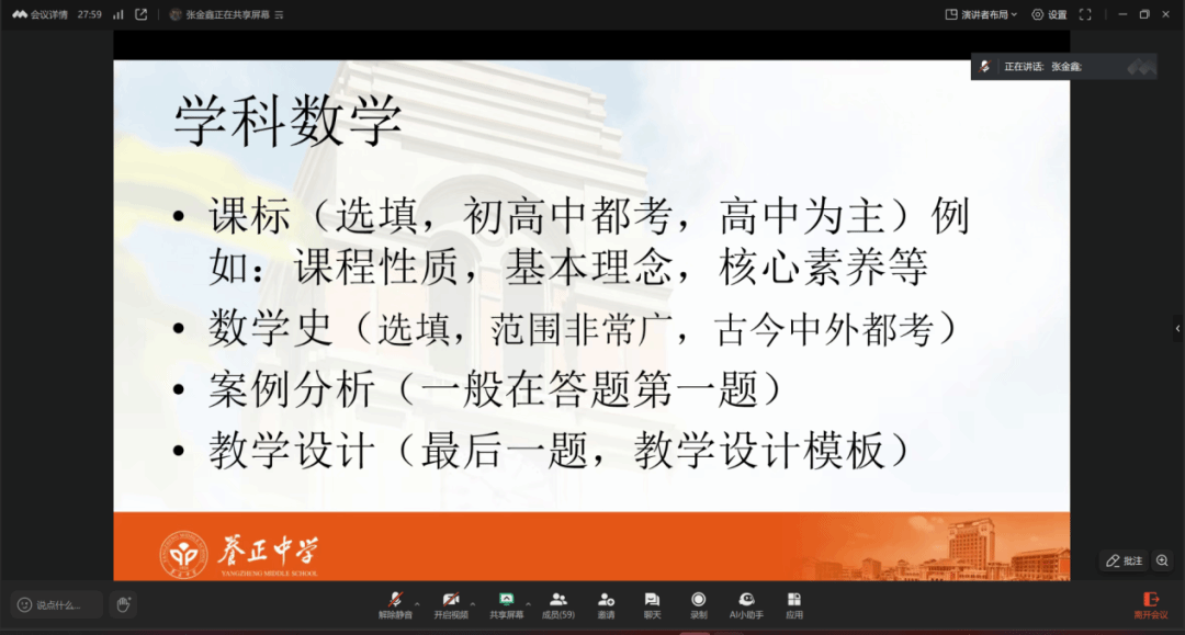 入职晋江市养正中学的张金鑫校友分享了个人备考教招的经验,教综部分他建议考生在考前突击时政和法规,特别是“新时代中小学教师职业十项准则”。学科数学部分他从课标、数学史、案例分析和教学设计等方面进行分析。最后张金鑫校友还强调考试当天的注意事项,如酒店预订、考场熟悉和相关物品的准备等。