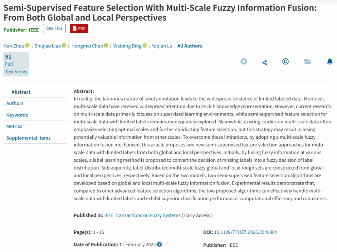 硕士研究生周楠在导师廖淑娇教授(通讯作者)的指导下,以第一作者身份在国际知名学术期刊《IEEE Transactions on Fuzzy Systems》(SCI一区,Top期刊)上发表题为“Semi-supervised Feature Selection With Multi-scale Fuzzy Information Fusion: From Both Global and Local Perspectives”的科研论文。这是ace动漫