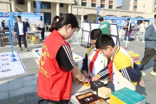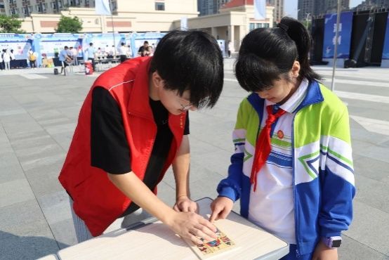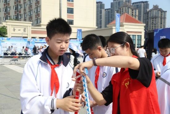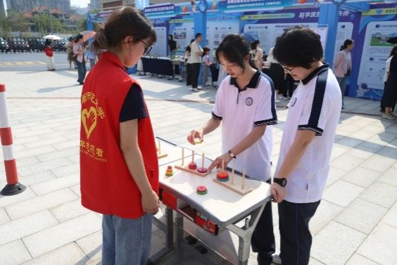 益智教具服务队以“魔尺探秘”“华容道博弈”“二阶魔方解构”“马蹄锁破译”“汉诺塔智斗”等系列数学益智教具挑战为载体,为现场师生与受邀嘉宾打造了一场别开生面的认知探险之旅。服务队成员以匠心精神构筑思维互动场域,通过默契协作构建起立体化指导体系:以专业素养拆解益智教具的逻辑密码,通过一对一实操指导与分步骤示范教学相结合的方式,为参与者搭建从观察到实践的认知阶梯。在每项教具的体验场景中,志愿者们化身引路人,既保持适度引导以维持挑战趣味,又及时提供关键点拨确保探索深度,使每位体验者在破解谜题的过程中实现思维跃迁,收获知行合一的沉浸式学习体验。