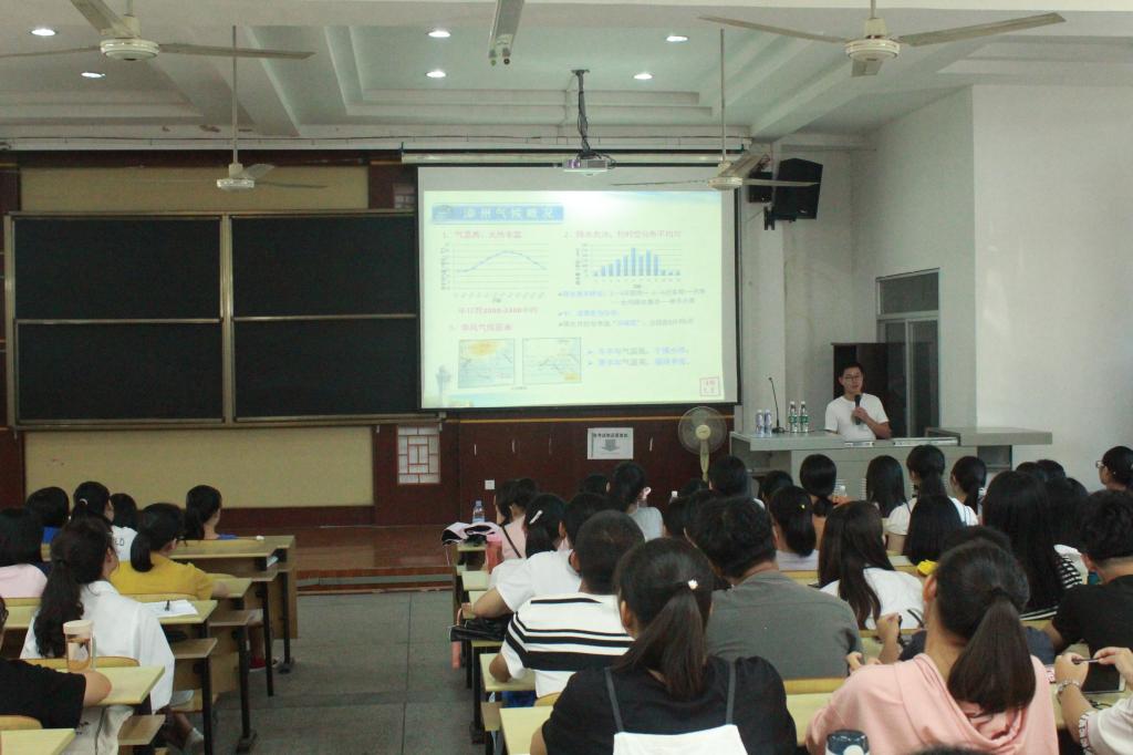 9月14日下午,漳州市天气预报主持人盛飞兵在砺志楼120教室开展了以“漳州天气和气象防灾减灾”为主题的气象科普讲座。