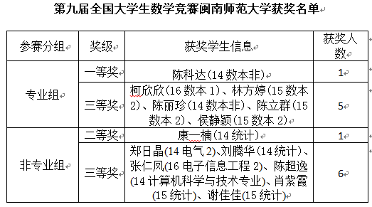 于10月28日组织学生参加第九届全国大学生数学竞赛福建赛区比赛。我校共有139人报名参赛,其中专业组83人,非专业组56人。最终我校学生分别获得专业组一等奖1名,三等奖5名,非专业组二等奖1名,三等奖6名。获奖名单如下: