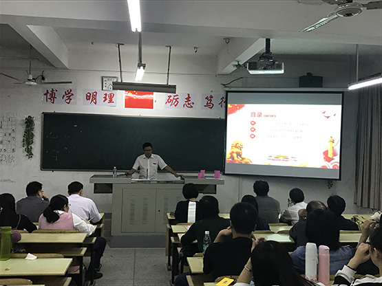 在砺志楼131室组织开展学习贯彻党的十九大精神宣讲报告。我校党的十九大精神宣讲团成员、马克思主义学院教师宋帮强副教授作题为《解读习近平总书记十九大报告——深入学习贯彻党的十九大精神》的报告。学院全体教工党员、学生党员、入党积极分子、主要学生干部代表参加报告会。