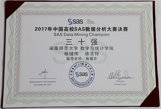 学子杨健伟、徐灵铃在指导老师施建华博士的带领下斩获全国三十强。据悉,今年的中国高校SAS数据分析大赛分三个阶段:第一阶段,9月20日到10月10日的主观题数据分析竞赛;第二阶段客观题上机竞赛(10月15日),福建赛区的选手在厦门大学嘉庚学院等三个省内高校进行。按赛制,两个阶段的成绩综合起来确定决赛名单。本届参赛的学员大部分来自应届毕业班,其SAS应用能力代表了国内毕业生的最高水平。今年参赛的队伍有来自全国各大高校的1036支队伍,参赛学生超过3000人,赛点扩展到全国31个省级赛区,全国综合排名前三十名的高校百分之百报名参赛,竞争激烈。通过选拔,有155支队伍进入决赛,我校ace动漫