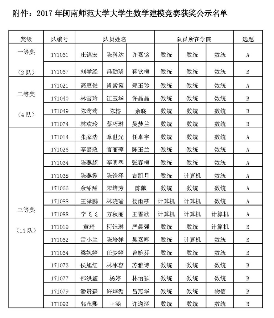大学生数学建模竞赛评阅工作已于2017年6月24日结束。为严肃竞赛纪律,杜绝不当之风,竞赛组委会决定设立获奖结果争议期,为期5天。现将获奖名单征求异议稿公布如下,公开征求广大师生的意见。