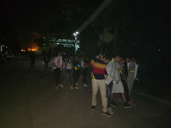 夜跑期间,设立重重关卡,同学们必须“手牵手过草地”、“翻越雪山”,完成指定任务,方能进入下一关。在遇到阻碍时,同学们众志成城,重温长征精神,齐心协力完成任务。