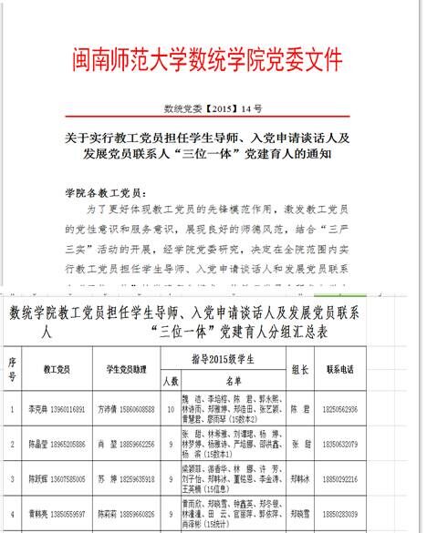积极探索,在原有党员导师制的基础上,大胆改革创新,推出教师党员担任学生导师、入党申请谈话人和发展党员联系人“三位一体”党建育人新模式,学院扣除6名在外读博、访学和2名特殊原因的教师党员外剩余的33名教师党员全部参与到活动中,每位党员导师指导8—11名15级新生,做到教师党员与15级新生“双覆盖”。党员导师负责对指导学生中有递交入党申请书的学生进行入党谈话,并担任其今后的入党发展联系人,定期对其进行考察,同时结合导师制的实施要求,每月定期与所有指导学生举行至少一次“一对一”、“一对多”的面谈指导。