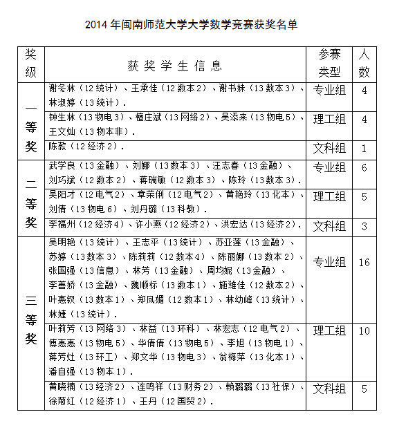 大学数学竞赛试卷评阅、评奖工作已于2014年12月2日结束。为严肃竞赛纪律,杜绝不当之风,竞赛组委会决定设立获奖结果争议期,为期7天(2014年12月2-9日)。现将获奖名单征求异议稿公布如下,公开征求广大师生的意见。