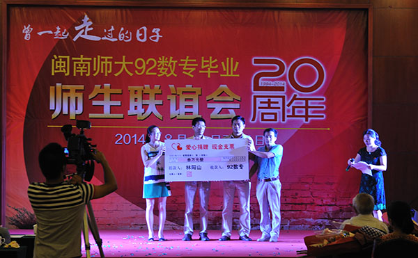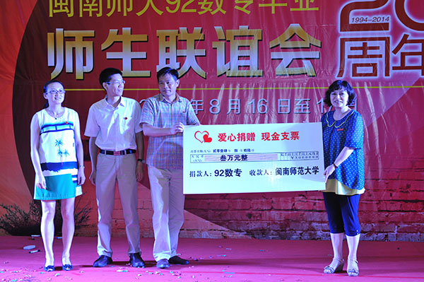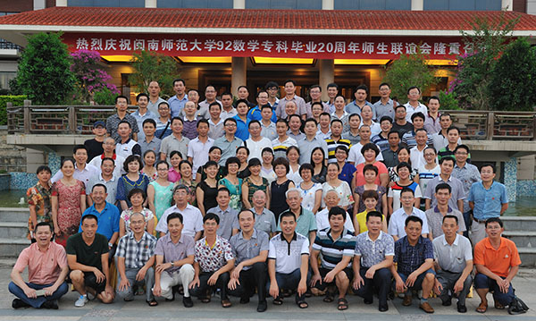 92级数学专科学生和老师一百多人齐聚长泰连氏大酒店,举行毕业20周年师生联谊会,校长助理林静华(原数学系副书记)、院长李克典、党总支书记徐志怀(原辅导员)、实习支教中心主任黄晓农,校友办副主任刘勤,计算机科学学院副院长陈宝兴,原数学系主任王桂芳, 原数学系党总支书记何清土,原成教院院长林斐等十五位领导和老师应邀出席。