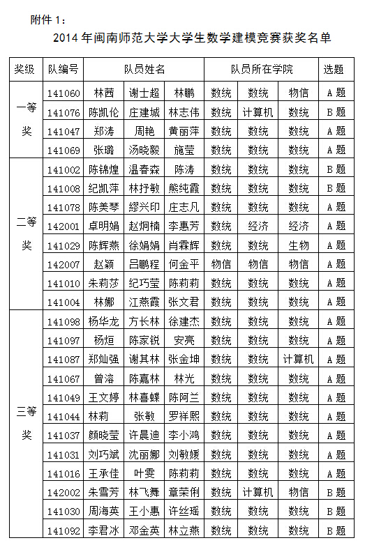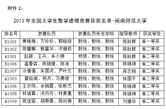 同时,对于参加2013年全国大学生数学建模竞赛,获得省一等奖1队(3名队员)、省二等奖8队(24名队员),教务处给予表彰,以资奖励,具体获奖名单见附件2。