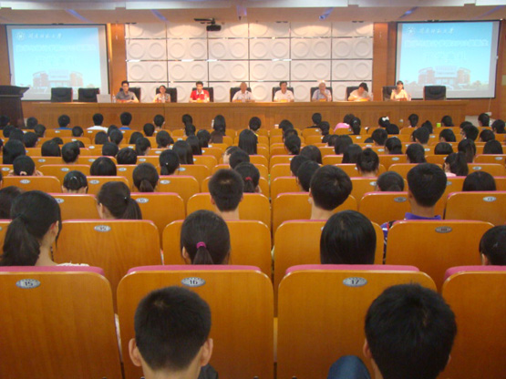 老生代表池晶首先代表全院在校学生对新生们表示热烈的欢迎,并以自己大学生活里的学习、工作和美国交换生经历为例,激励同学们做到自主、自信、自立。