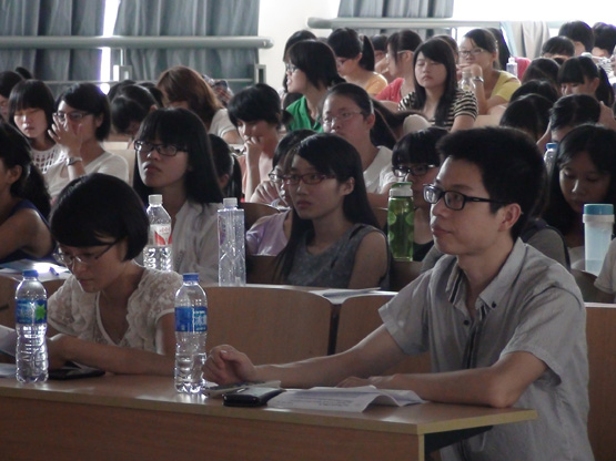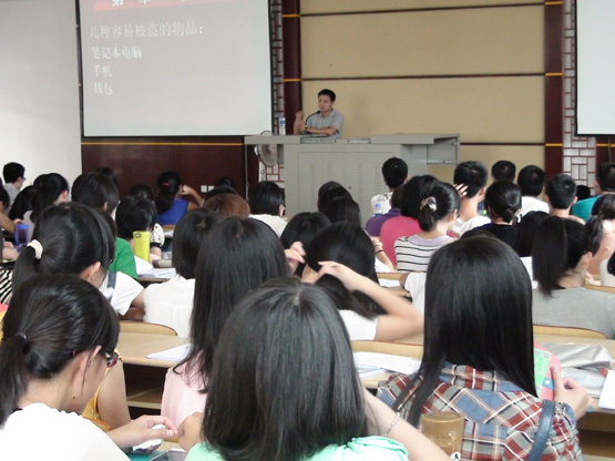 潘科长首先为同学们介绍了省内高校及本校发生过的安全事件,以触目惊心的案例告诉同学们安全的重要性。接着他从防盗、防火、防骗三个方面向同学们介绍了一些安全的注意事项以及一些自救自助的技巧,例如遇火灾如何逃,灭火器的使用方法等。