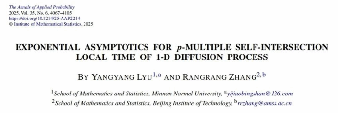 为第一单位,在概率论领域顶级期刊之一的《Annals of Applied Probability》上发表了题为“EXPONENTIAL ASYMPTOTICS FOR P-MULTIPLE SELF-INTERSECTION LOCAL TIME OF 1-D DIFFUSION PROCESS”的学术论文。