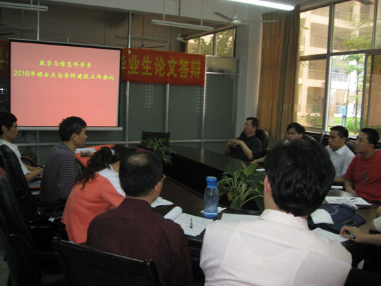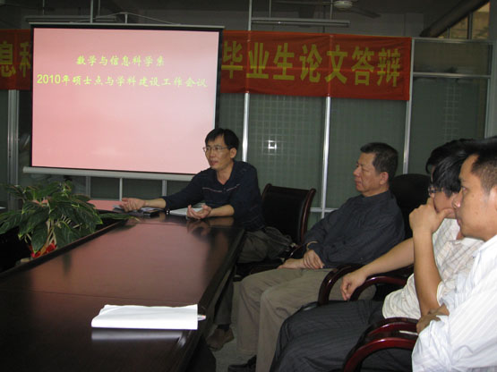 5月6日下午,我系蔡建平教授主持召开了2010年硕士点与学科建设工作会议。会上,蔡建平教授首先总结介绍了本系目前硕士点与学科的建设情况。主要包括本系学位点建设情况、学位点的申报情况、学科建设情况等。其次是各学科方向建设的负责人详细介绍本学科的发展情况。本次会议的另一个重点是讨论如何加强发展本系的硕士点与学科建设。围绕这一议题,与会的各位老师积极讨论,提出了很多宝贵的意见。比如如何加强人才引进,加强学术交流、加强学术团队的建设等。会议的最后是讨论一级硕士点建设材料与各学科建设材料的进一步完善等。