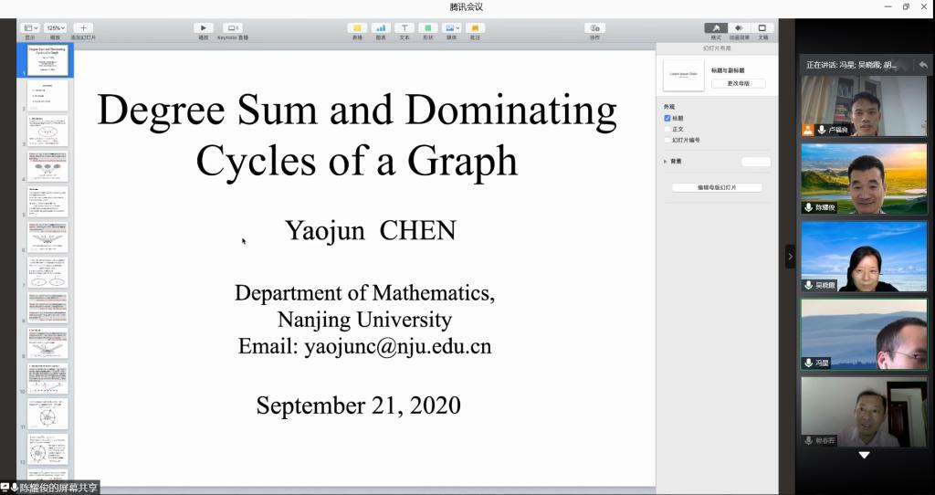 邀请,9月21日下午,南京大学陈耀俊教授在腾讯会议作了题为《DegreeSum andDominatingCyclesof a Graph》的报告。相关师生聆听了此次报告,报告由卢福良教授主持。