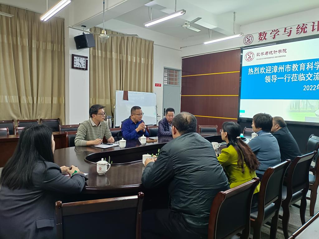 的师资力量,推动漳州市中小学数学学科竞赛活动开展,力争取得更好的成效。在交流过程中,双方就漳州市中小学数学竞赛遇到的瓶颈问题、如何落实福建省高中数学竞赛学生选拔,竞赛教师组建及培训,以及师范生教师技能竞赛培训教师团队组建培训等相关问题进行了交流和探讨,达成了广泛共识。