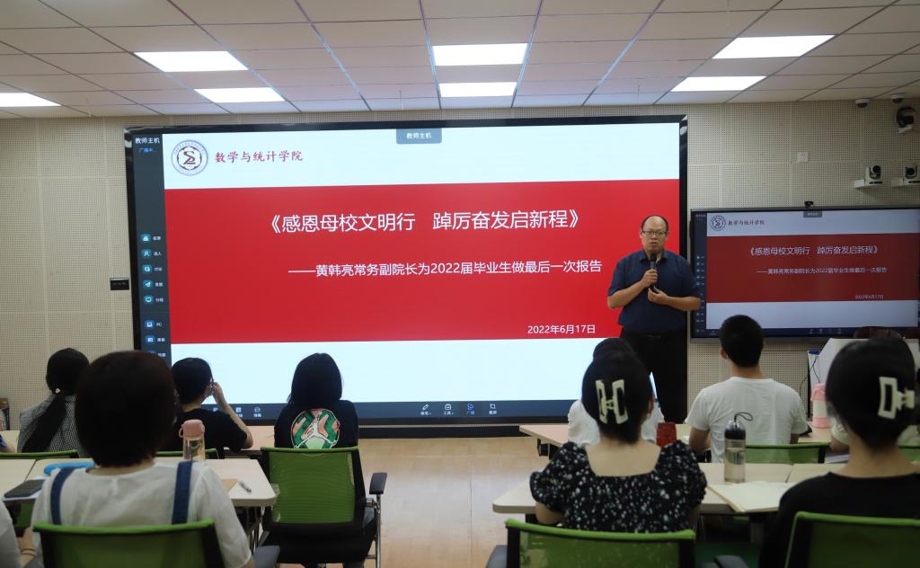 6月17日,学院常务副院长黄韩亮于砺志楼131为学院毕业生做最后一次报告,围绕“感恩,自信,自律,自立”就毕业生的未来发展提供了专业的建议,引导毕业生成长思源、成才思进。报告在同学们热烈的掌声中圆满结束,2022届毕业生们纷纷表示将铭记母校教诲,踏上光辉灿烂的人生旅途。