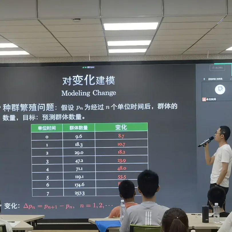 上午,张瑞老师主讲的“数学建模漫谈”。讲座开始时,张瑞老师用三个英语词组给学员们提出了学习数学的建议:Calm Down(平静下来)、Forget the Rules(忘记所谓的条条框框)、Keep “Crazy”(保持狂热有激情)。然后,张瑞老师以“What”(是什么)、“Why”(为什么)、“How”(怎么办)这三个“W”为切入点,向学员们介绍数学建模的发展历程,使同学们深刻领悟了数学中的经典模型是从生活中来到生活中去的理想化模型。最后,张瑞老师提出“如何刻画连续变化的量”(如温度、速度、作用力)的问题,向学员们展示了建立数学模型的基本过程。
