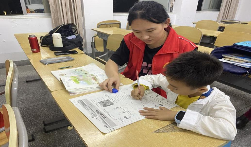 现在,让我们一同移步爱心助教活动现场。在辅导的过程中,爱心助教老师为学生答疑解惑,提供专业、优质的一对一教学服务,学生学习认真专注,向老师积极请教,活动现场一片融洽。
