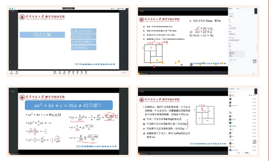 副教授黄菊老师为学子们进行线上培训。会议开始,黄老师以一个数学小游戏开启下午的课程,引入会议的主题“代数—因式分解”。其次,黄老师从简单的问题切入,以层层递进的教学引发同学们积极探索。在课程中,黄老师向我们介绍了四种因式分解方法,通过老师的充分讲解和课堂练习,同学们已然初步掌握方法。