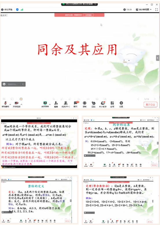 副教授冯真真老师为同学们讲解关于数论的知识。会议中,冯老师展现出了卓越的教学风采。冯老师讲解数论相关性质时,逻辑清晰,条理分明,将复杂的知识点讲解得深入浅出,使抽象的概念变得具体可感,让同学们易于理解。在讲解过程中,冯老师将性质与例题相结合,不仅传授知识,更注重培养同学们的思维能力,通过提问和解答,引导同学们主动探索,激发其求知欲。