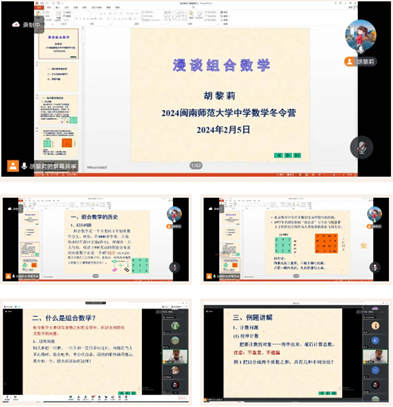 副教授胡黎莉老师为学子们进行线上培训。会上,胡老师围绕“组合数学的历史”、“什么是组合数学”和“典型问题”三个方面为同学们深入浅出地讲授课题。课堂中胡老师用不同例题从各个方面生动的讲解组合数学在生活中的应用,让同学们更加深入地理解数学知识的应用价值和实际意义。
