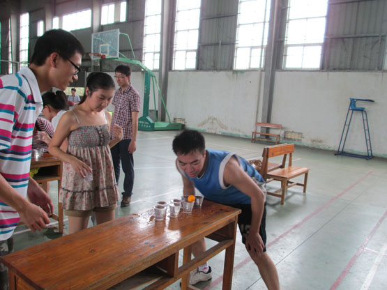 本次趣味运动会以 “友谊第一,比赛第二”的宗旨,以 “娱乐身心,激扬青春“为主题。活动分为两类:活动一是团体记分赛,包括踢足球——羽毛球赛——篮球赛——兵乓球赛——跳绳赛;活动二是团体合作赛,包括两人三足——跳长绳。活动一开始,同学们分组进行、积极配合、争分夺秒、你追我赶,整个球类馆充满了欢声笑语、散满了辛勤汗水。
