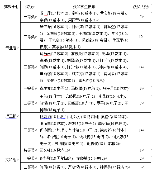 大学数学竞赛试卷评阅、评奖工作已于2019年5月25日结束。针对此次竞赛中成绩特别突出的一位选手,经竞赛组委会讨论决定,给予16经济1班郑文锋同学文科组特等奖。同时给予17数本2班游一萍等58位同学各分组(专业组、理工组与文科组)一二三等奖。为严肃竞赛纪律,杜绝不当之风,竞赛组委会决定设立获奖结果争议期,为期7天(2019年5月30日-6月5日)。现将拟获奖名单(见附件、统一等级内排名不分先后)公布如下,公开征求广大师生的意见。
