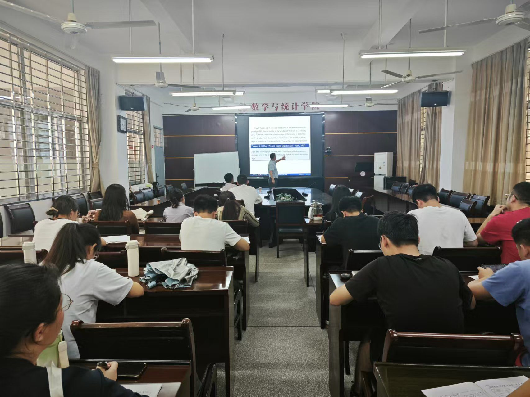 报告中,张和平教授介绍了关于每个极小 k-因子临界图的最小度是否都为 k+1这个猜想的最新进展。张和平教授利用一种新方法,证实了该猜想对于 k=2, n-8, n-10 成立,同时也证实了该猜想对于爪无关图和平面图成立。此外,张和平教授还介绍了关于每一个3-连通的极小双临界无爪图G的研究成果, 为其他学者关于最小砖块中三次顶点数目的猜想提供了进一步的证据。报告结束后,在座的师生就相关研究问题进行了探讨和交流。