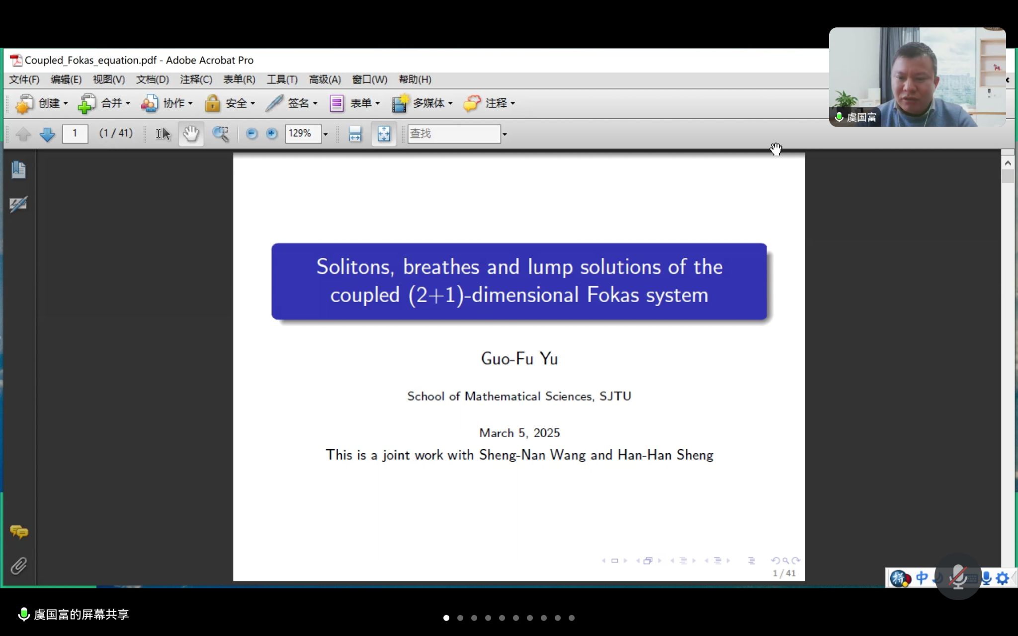 邀请,3月5日下午,上海交通大学虞国富教授在腾讯会议作了题为《Various solutions of the coupled (2+1)-dimensional Fokas system》的报告。相关师生聆听了此次报告,报告由樊方成老师主持。