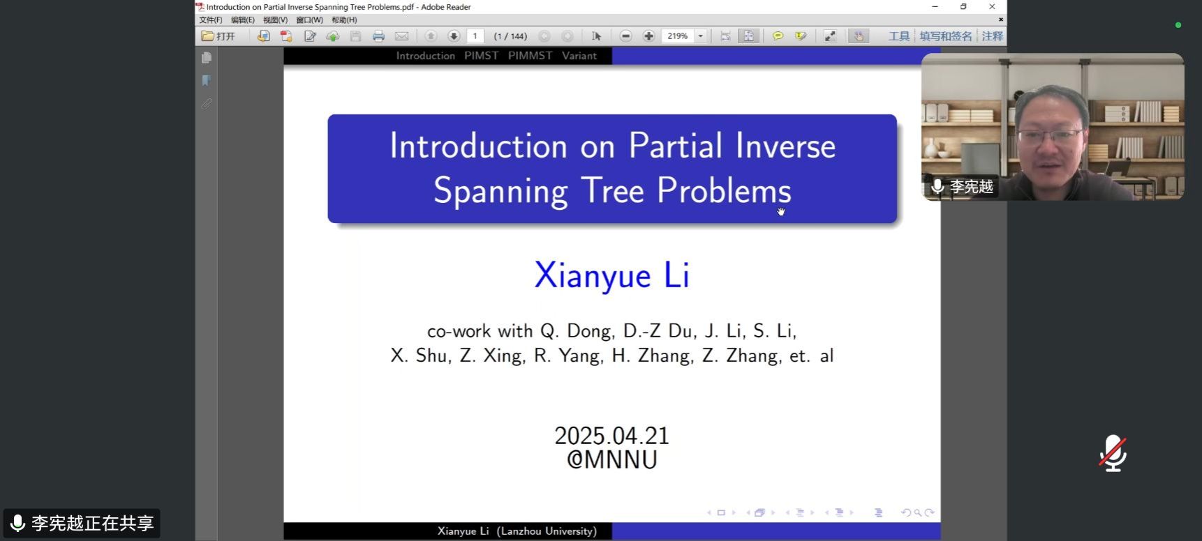 邀请,4月21日下午,兰州大学李宪越教授在腾讯会议作了题为《Introduction on Partial Inverse Spanning Tree Problem》的报告。相关师生聆听了此次报告,报告由卢福良老师主持。