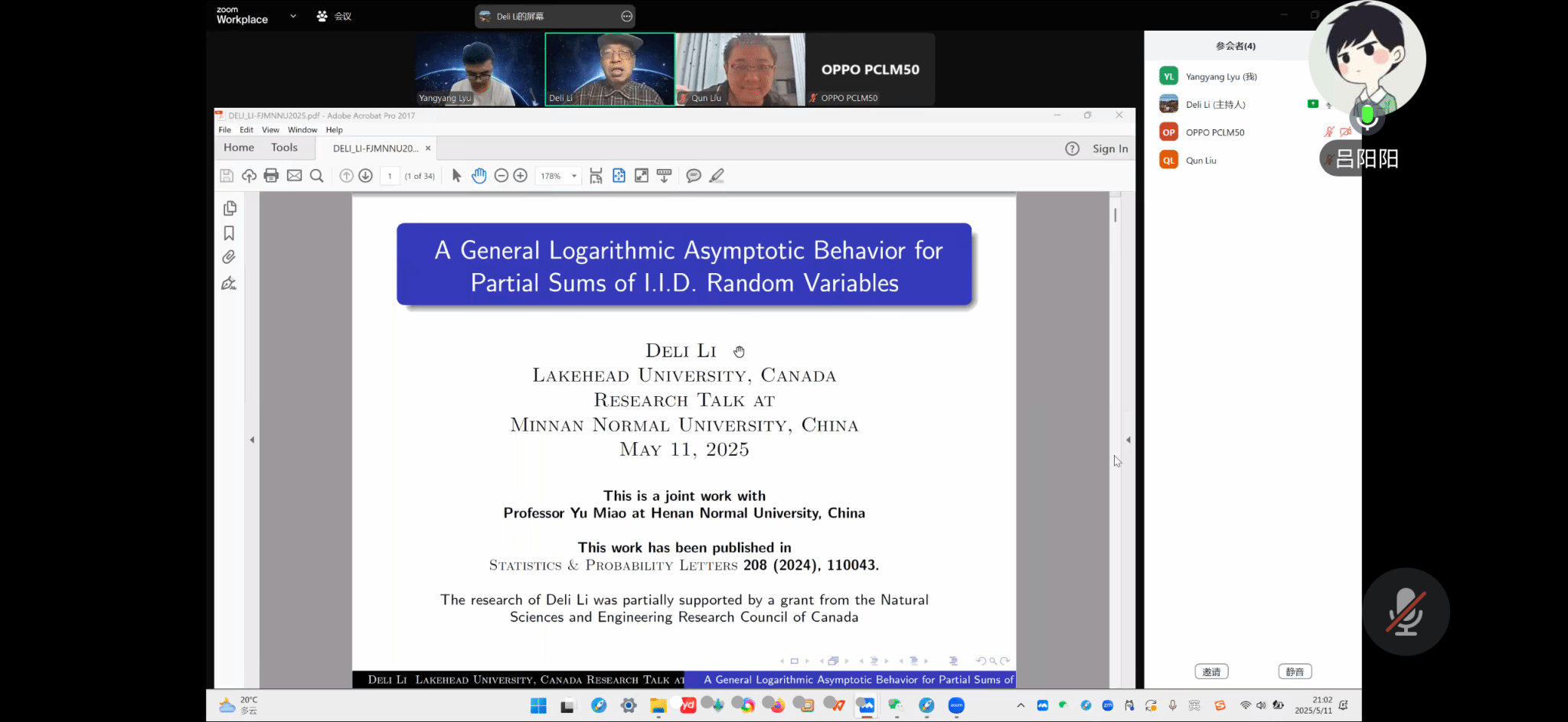 邀请,5月11日晚上,加拿大湖首大学李德立教授在腾讯会议中作了题为《A general logarithmic asymptotic behavior for partial sums of i.i.d. random variables》的讲座。相关师生聆听了此次讲座,该讲座由孙慧老师主持。