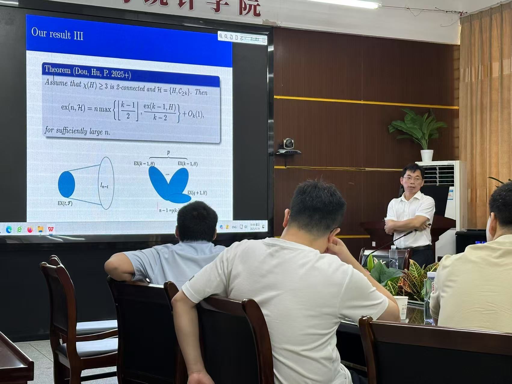 邀请,6月29日早上,安徽大学彭兴教授在砺志楼114作了题为《Turan number of cliques plus cycles and related problems》的讲座。相关师生聆听了此次讲座,讲座由卢福良老师主持。