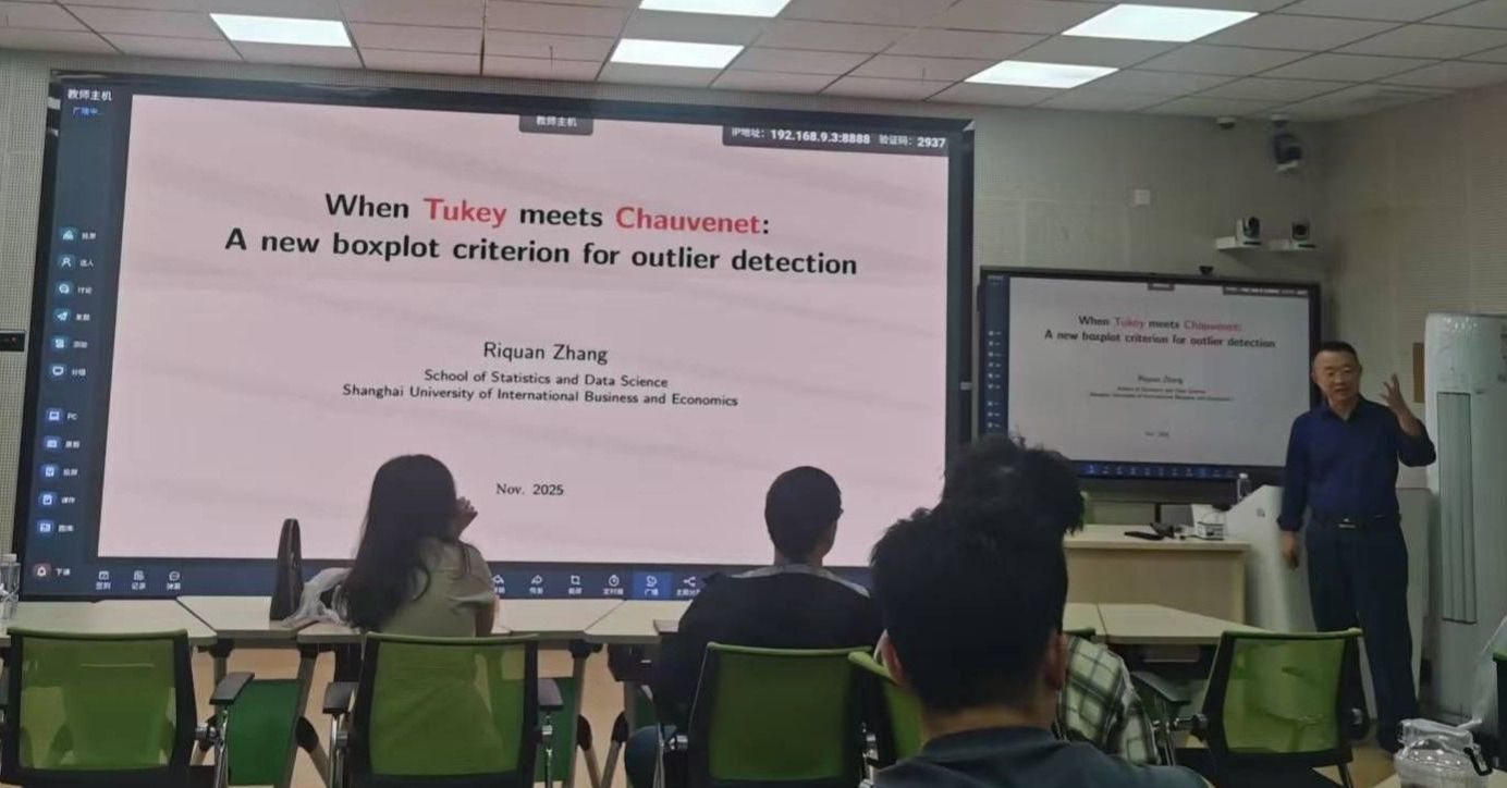 邀请,11月13日下午,上海对外经贸大学张日权教授在砺志楼131作了题为《When Tukey meets Chauvenet: A new boxplot criterion for outlier detection(1-2)》的讲座。相关师生聆听了此次讲座,讲座由李气芳老师主持。