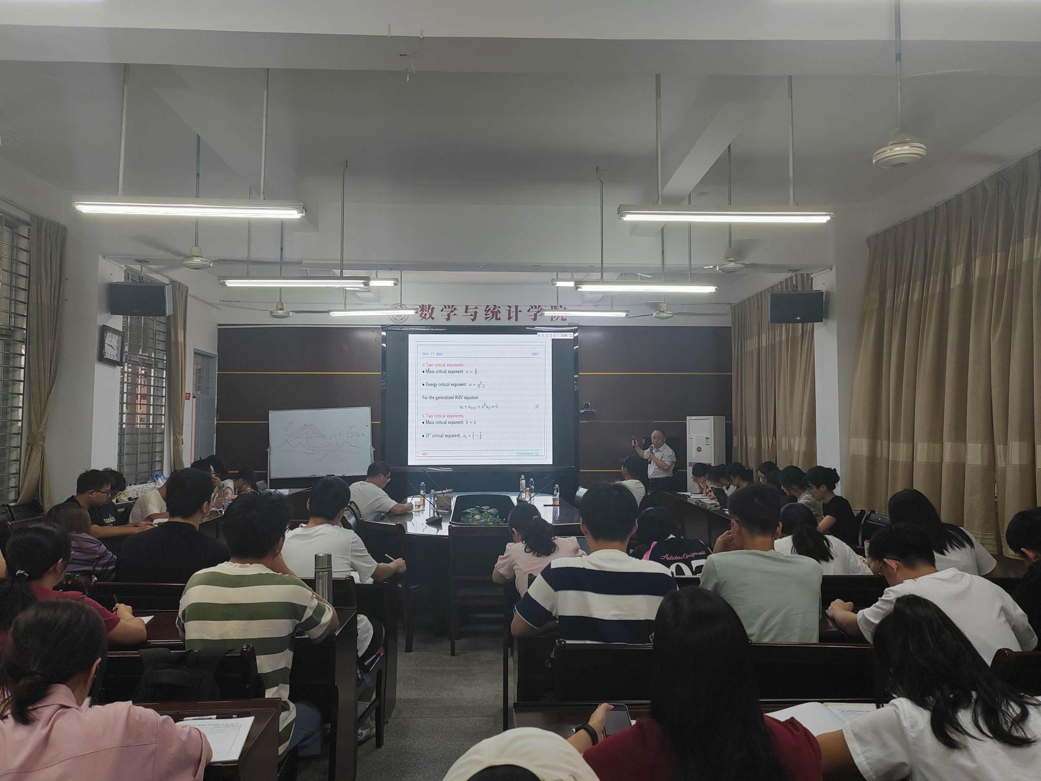 邀请,10月17日下午,宁波大学屈长征教授在砺志楼114作了题为《Integrability and Stability of Solitons to Nonlinear Dispersive Equations》的报告。相关师生聆听了此次报告,报告由黄韩亮老师主持。