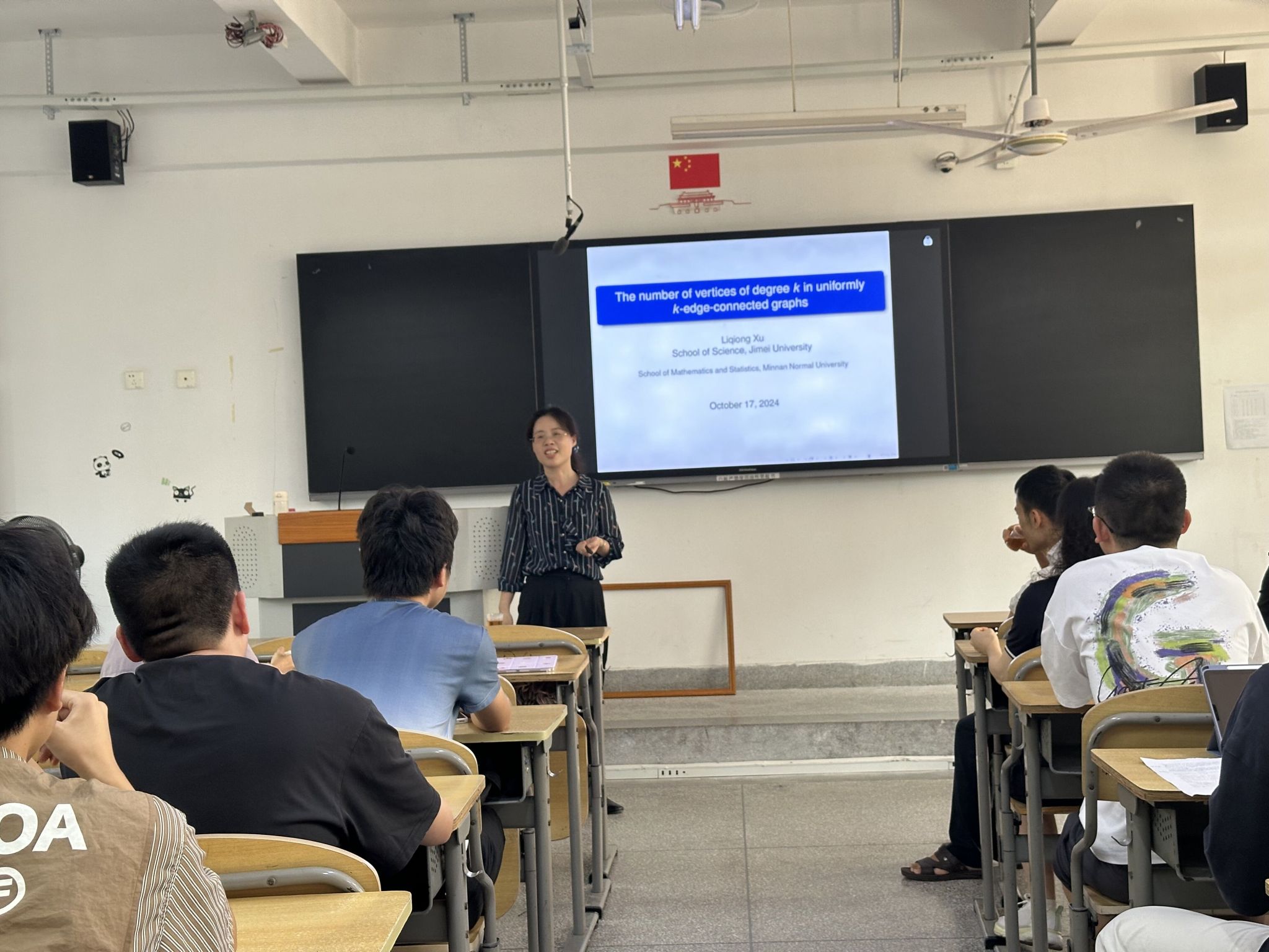 邀请,10月17日下午集美大学徐丽琼教授在砺志楼304作了题为《The number of vertices of degree k in uniformly k-edge-connected graphs》的报告。相关师生聆听了此次报告,报告由卢福良老师主持。