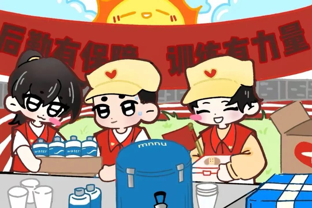 红马甲穿梭在训练场,把后勤的暖、训练的劲,都缝进了军训那抹炽热的红里。